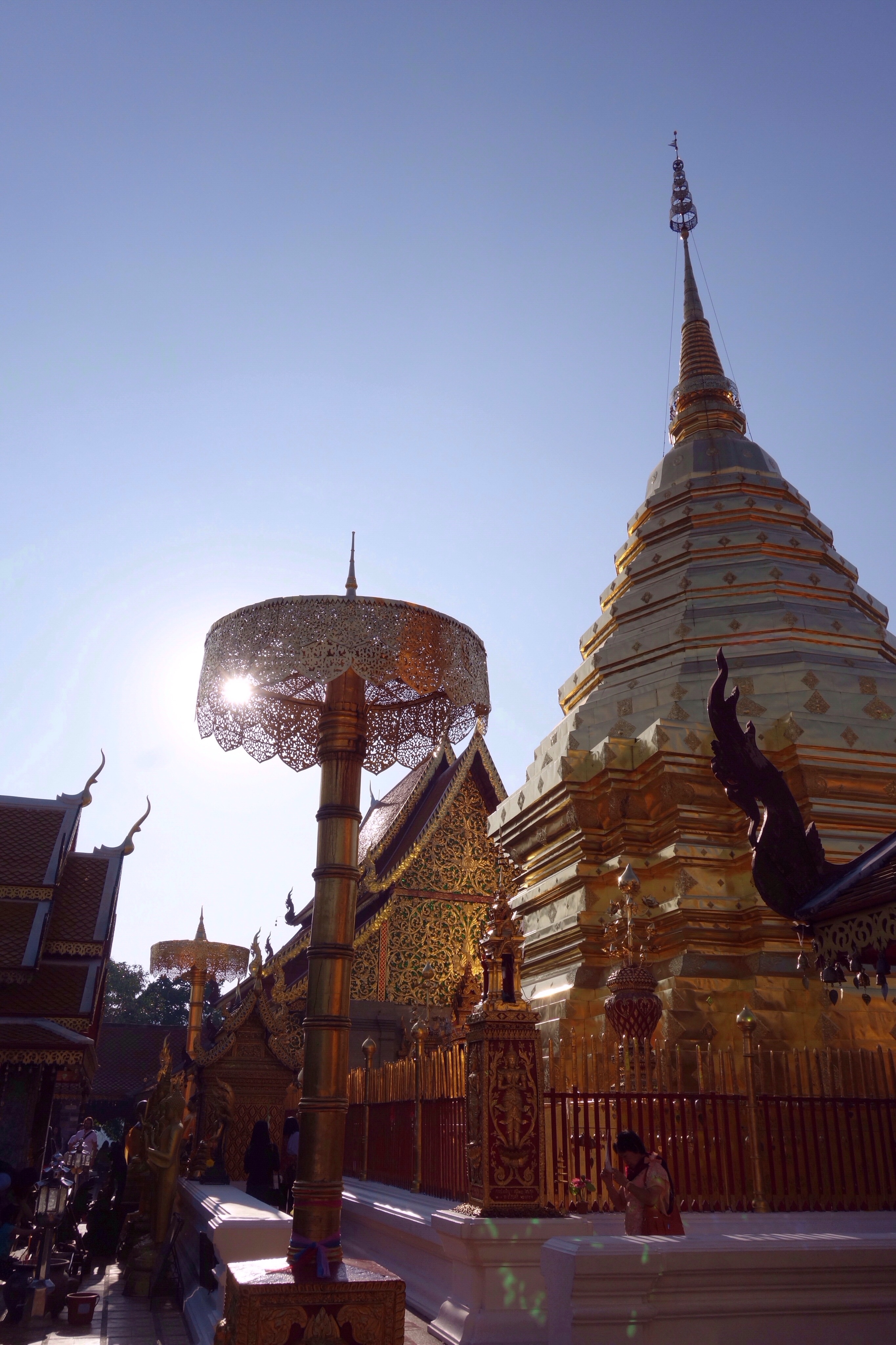 Zurück zu Chiang Mai – besser bekannt als Tempelstadt des thailändischen Nordens. Natürlich haben wir uns neben einheimischer Küche und dem Ausflug ins Umland auch der buddhistischen Kultur gewidmet und waren auf Tempeltour in der im Vergleich zu Bangkok doch sehr kleinstädtischen Metropole des Nordens. Diese ist im Vergleich zum Süden doch stark europäisch angehaucht ist und die Herrscharen an Backpackern lassen Ferienlagerstimmung aufkommen. Aber zurück zu den Tempeln: Die wichtigsten Regeln kannten wir ja bereits: Niemals schulterfrei in Tempel, keine tiefen Ausschnitte (Sorry Heiner, ein Glück bist du nicht Mönch geworden!), keine Shorts und schon gar keinen Minirock, Mönche nicht anfassen oder anmachen und SCHUHE AUS!!! Auch die Stiefeletten müssen draussen bleiben – ach Menno!
